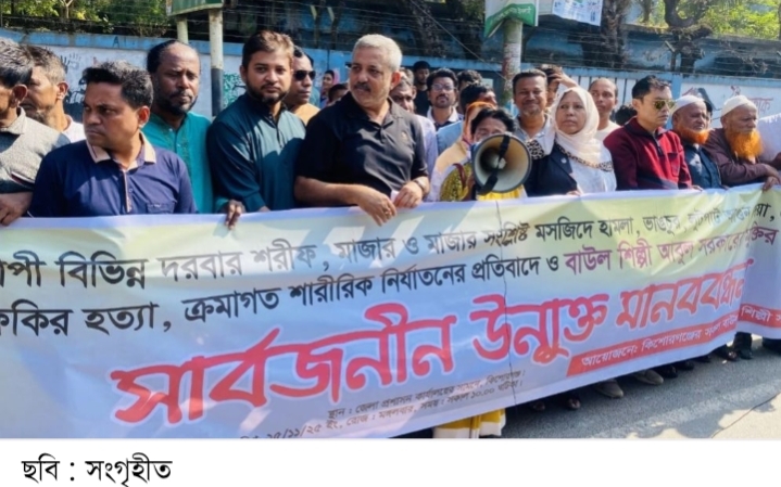 দেশব্যাপী বিভিন্ন দরবার শরীফ, মাজার ও সংশ্লিষ্ট মসজিদে হামলা, ভাঙচুর, লুটপাট, আগুন দেওয়া ও হেনস্তার প্রতিবাদে এবং বাউল শিল্পী আবুল সরকারের মুক্তির দাবিতে কিশোরগঞ্জে মানববন্ধন করেছেন বাউল সাধক ও শিল্প সমাজ।